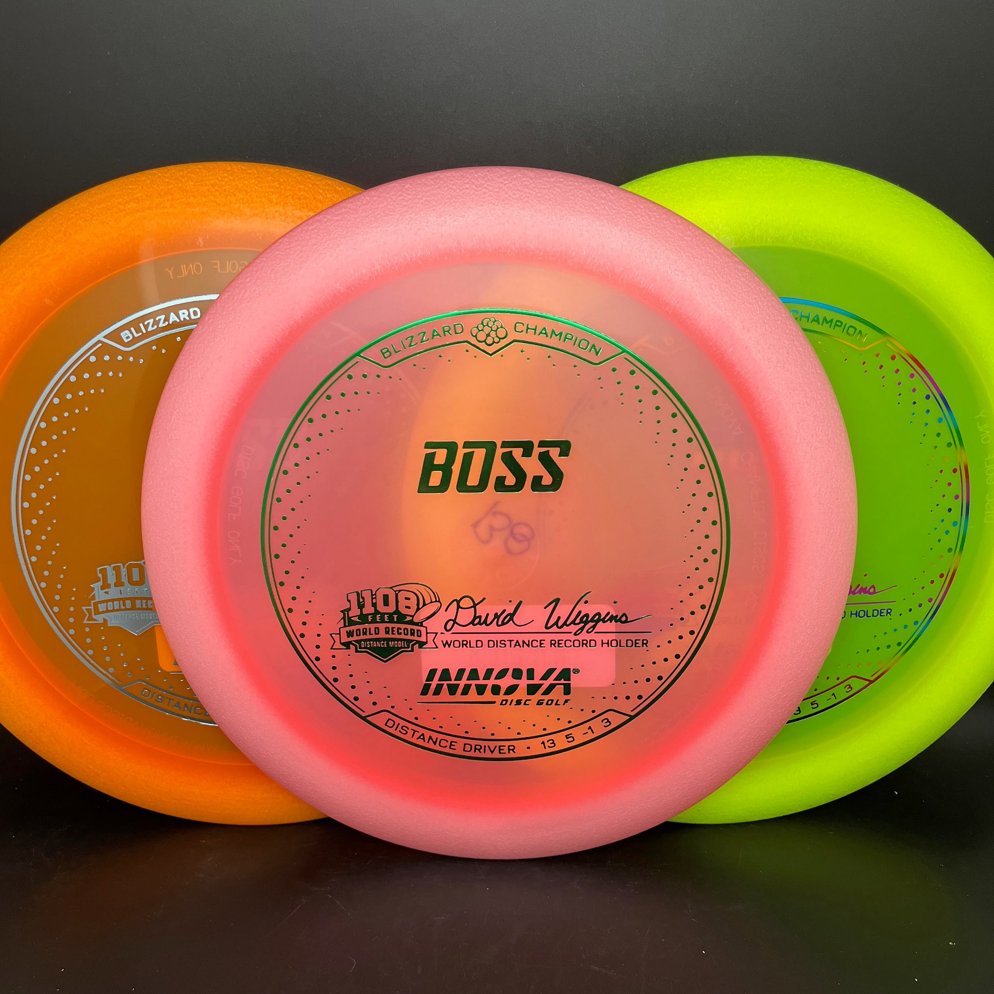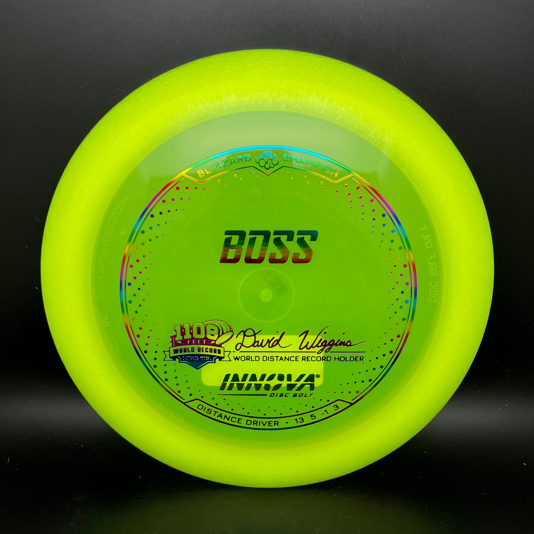This is a fast stable driver that can handle full power throws and moderate headwinds. Advanced players and sidearm throwers will appreciate the dependable stability. The Boss has a slight high speed turn to help maximize distance with a predictable fade. David Wiggins Jr used a 154 gram R-Pro Boss to set the World Record 338 M (1108.92 feet) for the longest throw in March 2016. The Champion Boss flight numbers have been updated to better reflect the more stable flight.