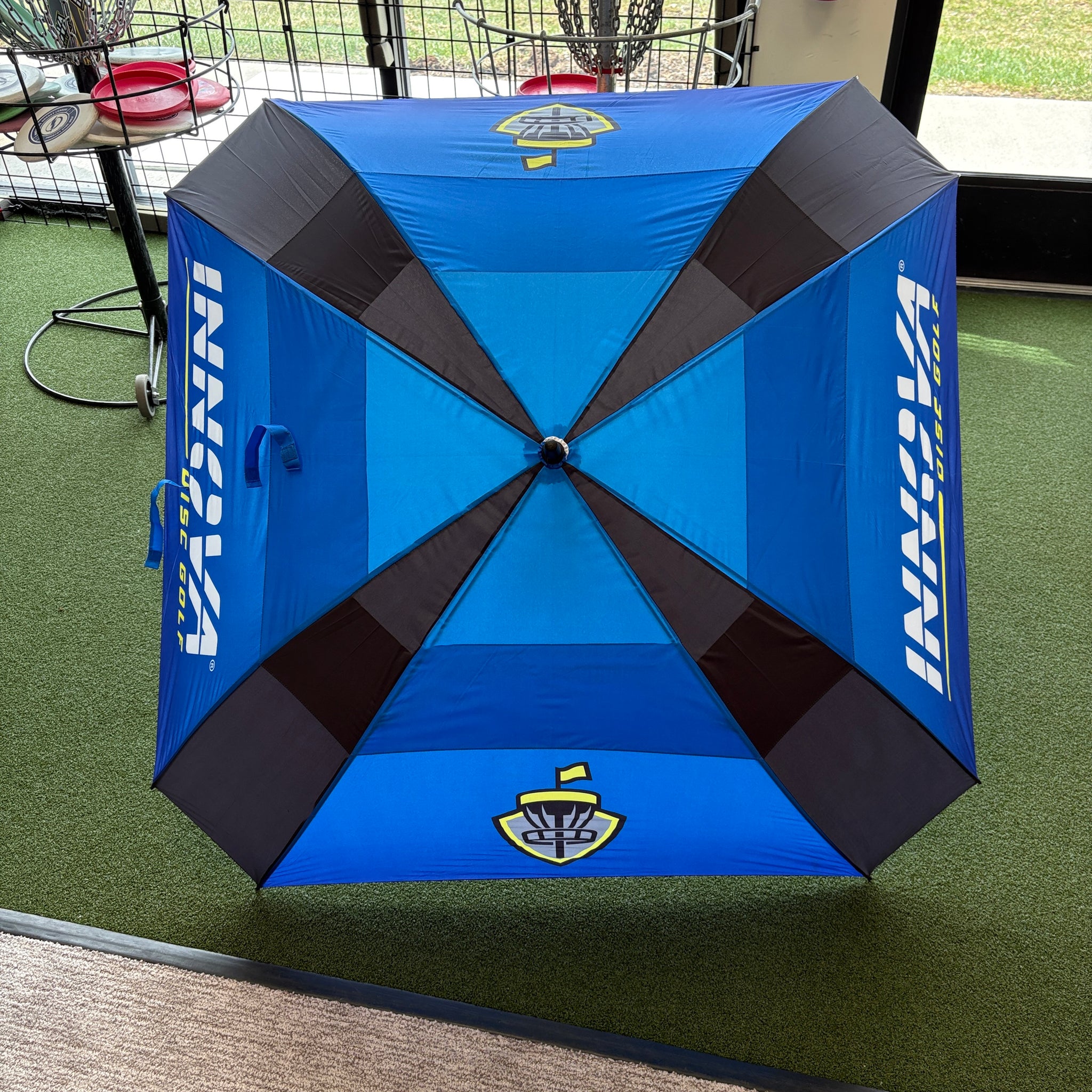 This premium golf umbrella opens and closes like a dream. Plus it’s got room to spare to keep you, your discs, and a friend rain free.